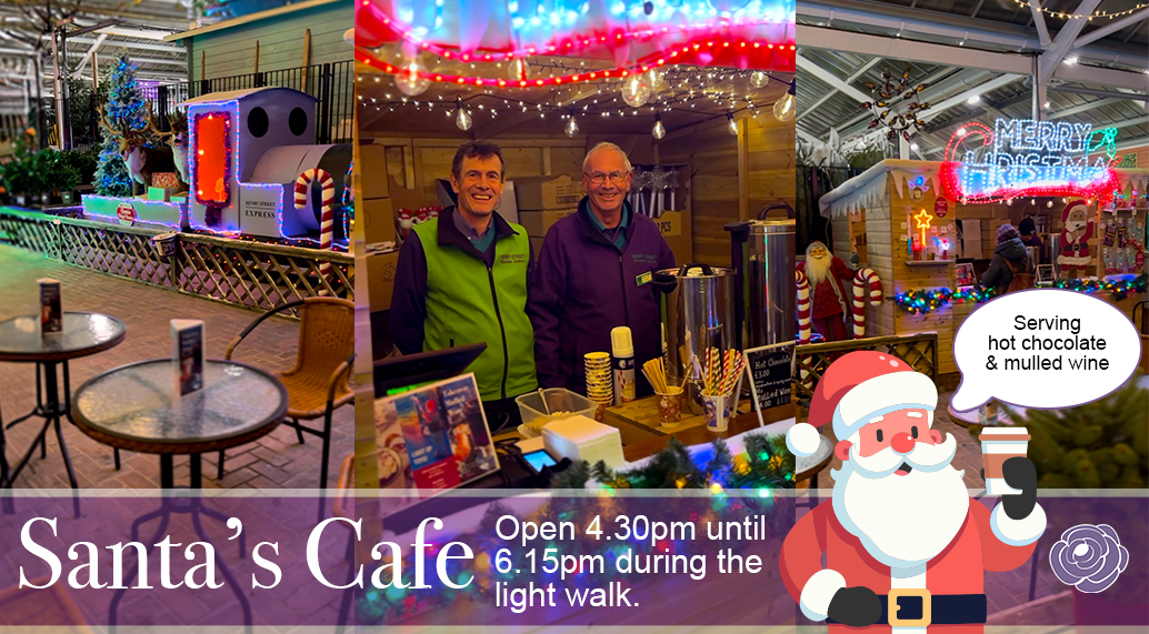 The new outdoor light display will turn on from 4.30pm every Tuesday, Wednesday, Thursday and Friday from the 27th of November until the 23rd of December. We will stay open until 6.30pm on those days for late night shopping. The Restaurant will be open and serving its full hot food menu until 5.30pm (restaurant closes at 6.00pm). We also have Santas cafe in the light walk that will be serving hot chocolate and mulled wine until 6.15!