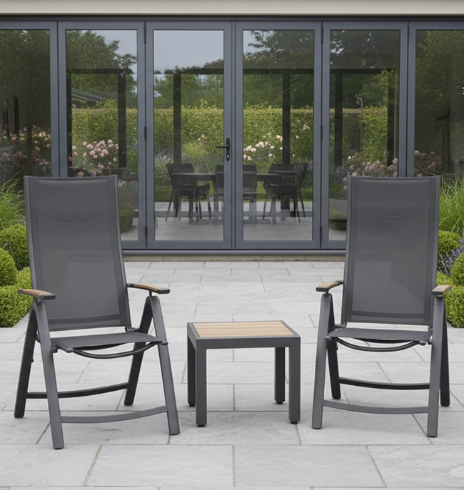 The Srenna reclining in-between set has a rust free aluminium frame with a textaline back. The chairs and table are fully weather proof so can be left outside all your round. The table has a high quality aluminium maintenance free wood effect top.